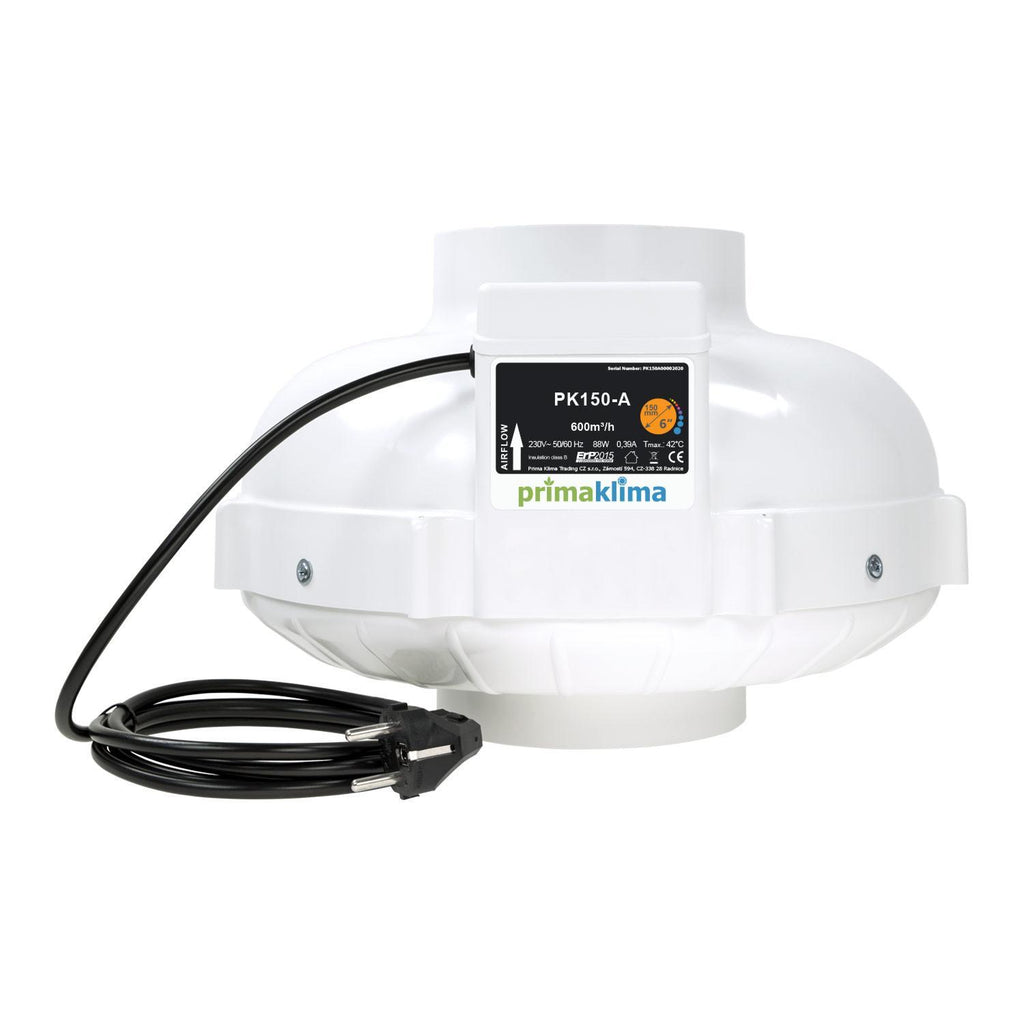 The Prima Klima PK150-L is highly efficient inline duct fan equipped with an MES AC motor with backward curved blades which has been optimally adapted to the housing. The device is extremely silent when is switched to low speed. The entire housing is made of high impact resistant, flame proof polyamide (nylon). Maintance free long lasting ball bearings contribute to especially smooth running of the motor. The control system, the connections and the capacitor are fully integrated into the housing. With the use of the supplied mounting bracket the fan can be easily and safely attached to the wall or ceiling in any position. Available in a 115V version and with alternative connection cables.