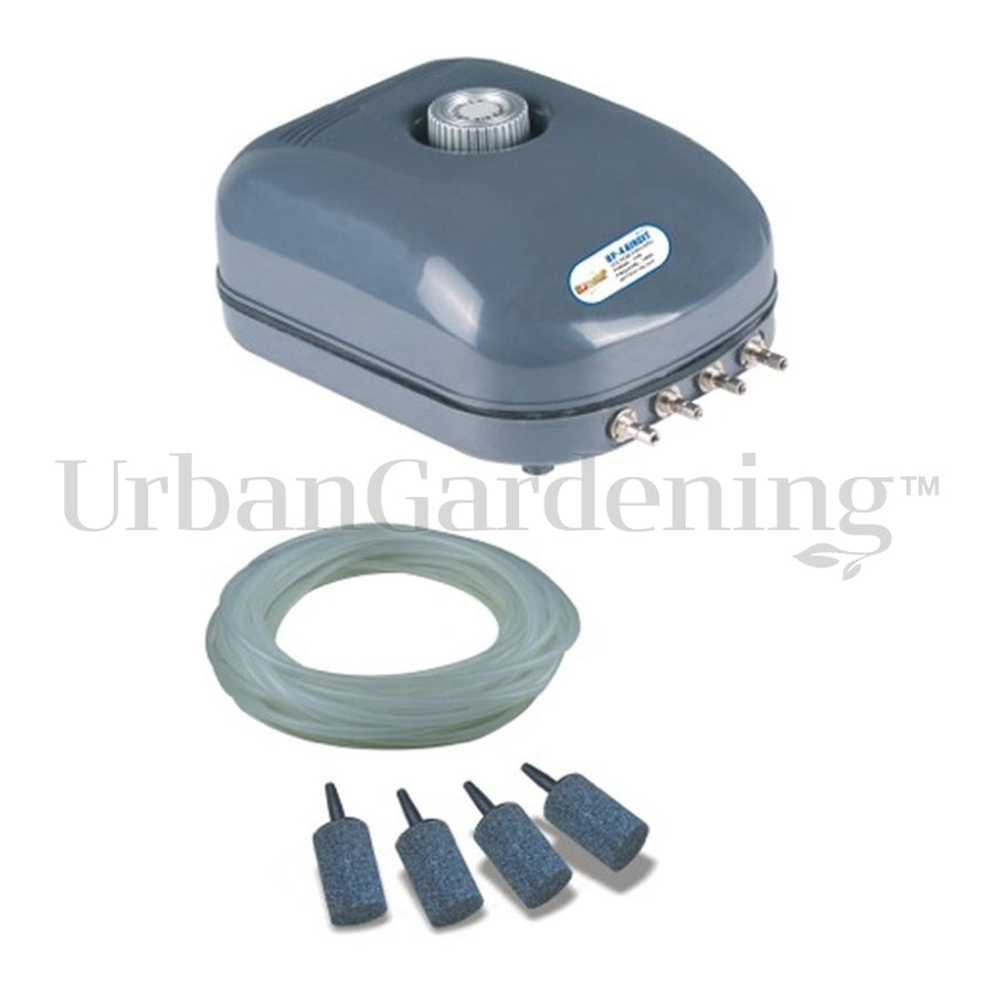 RP 4 õhupump võimaldab ühendada 4 õhuvoolikut ja mullikivi. Need kuuluvad komplekti.