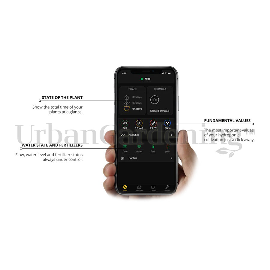 Nido controls and maintains the optimal ranges of the nutrient solution of your hydroponic system, managing the pH- and up to 3 independent fertilizers.