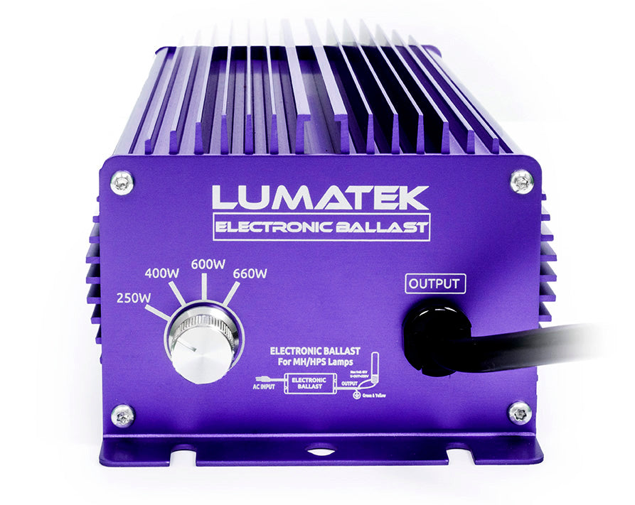 Featuring 4 different settings from 250w to 660W, Lumatek digital ballasts can be used progressively to give the optimum performance for each stage of your grow and can be used with both high pressure sodium or metal halide lamps.