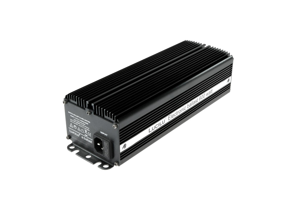 The LUCILU E-Ballast ensures the connected lamp has a much longer life due to its elaborate Soft-Start function with a low starting current. The ballast works almost without loss and is perfectly shielded against escaping radiation of any frequency. The higher operating frequency ensures Flicker-Free operation and thus a better quality of light. The LUCILU is fully equipped with a fine fuse, power cord and 4m connection cable for connecting the reflector. Soft rubber base provides a stable position which absorbs the last vibrations so it runs quietly. The case is made from an extruded aluminium profile and holds both long and efficient cooling fins as well as a mother rail for a hanging attachment. Suitable for operating with Metal Halide lamps (MH) and High Pressure Sodium lamps (HPS).