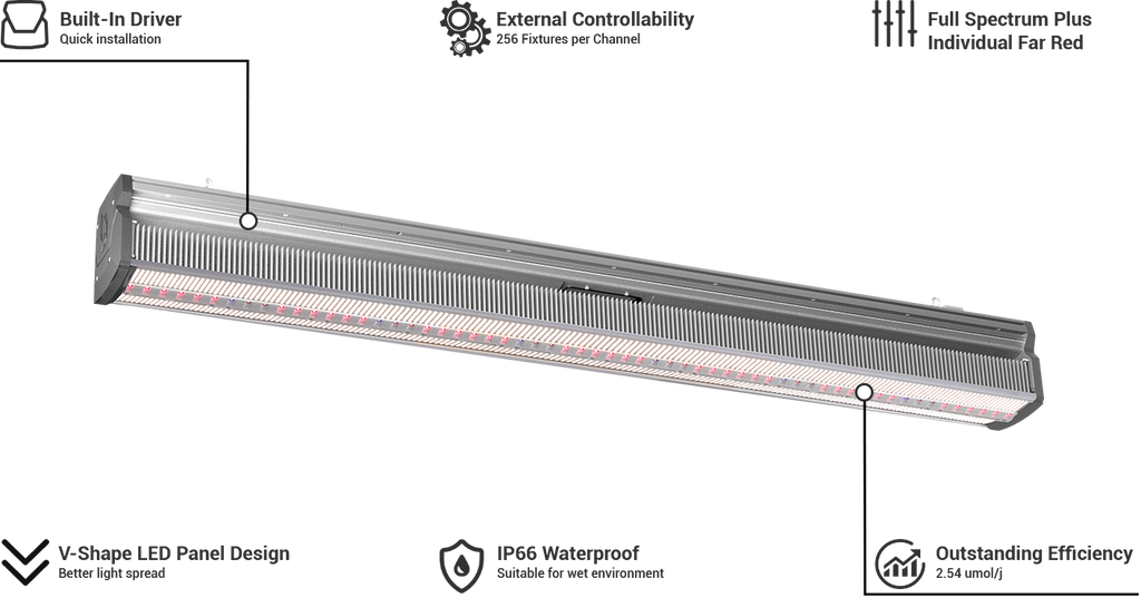 Full spectrum design with UV provides better spectrum similar to the natural sunlight covering each critical phase of growth from vegetative to flowering. It provides great external control ability and allows up to 256 fixtures per channel with outstanding efficiency at 2.54 umol/J.