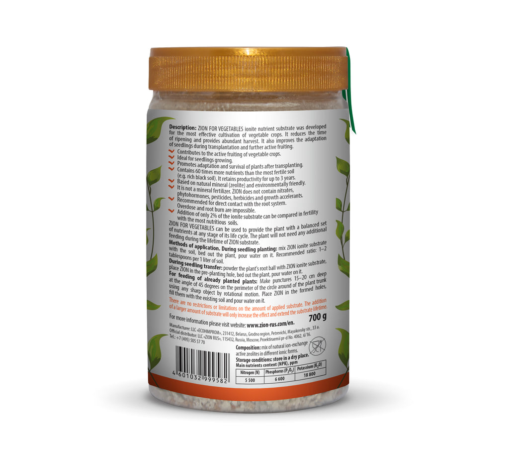 Ionite nutrient substrate ZION for VEGETABLES provides intensive plant growth, the development of a strong root system, reduces the time of ripening of the crop. It contributes to the adaptation of seedlings during transplantation and active fruiting of vegetable crops. ZION can be used both independently and in the form of small corrective additives to any bases (depleted and degraded soils, sand, perlite, vermiculite, unbalanced soil of any composition, etc.).
