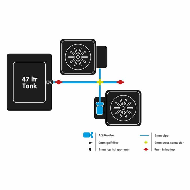 The 2Pot System is easily extended so many pots can be linked to a single tank. Please see examples of typical layouts using 9mm pipe (or 16mm pipe). The pots & trays can be easily moved at will, if the plants grow too large they can be spaced further apart with ease. Once set up and a tank is filled with water & liquid feed this extremely versatile system will completely take care of all your plants needs.