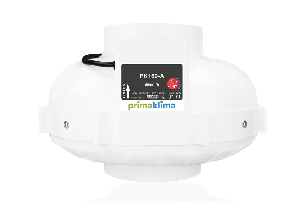 The Prima Klima PK160-A is highly efficient inline duct fan equipped with an ebm-papst RadiCal centrifugal motor with backward curved blades which has been optimally adapted to the housing. The device is extremely silent when is switched to low speed. The entire housing is made of high impact resistant, flame proof polyamide (nylon). Maintance free long lasting ball bearings contribute to especially smooth running of the motor. The control system, the connections and the capacitor are fully integrated into the housing. With the use of the supplied mounting bracket the fan can be easily and safely attached to the wall or ceiling in any position. Available in a 115V version and with alternative connection cables.
